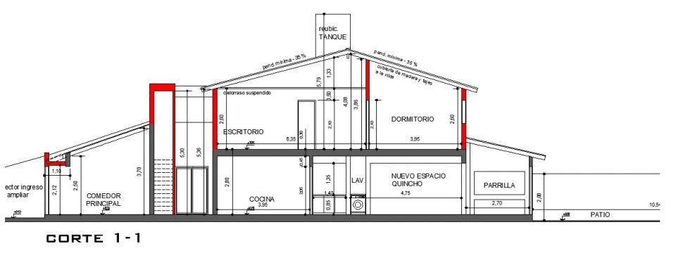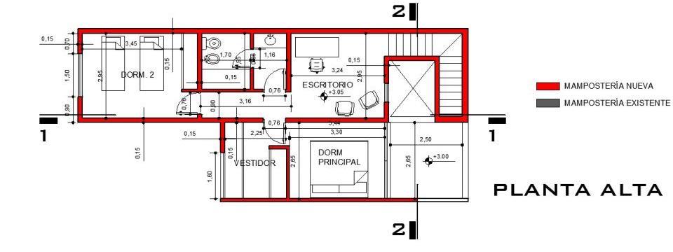 Se plantea la necesidad de incorporar metros cuadrados a la vivienda con un programa de necesidades adecuado a planta alta. dos dormitorios, uno principal con vestidor, un baño y escritorio. superficie total 65 m2.